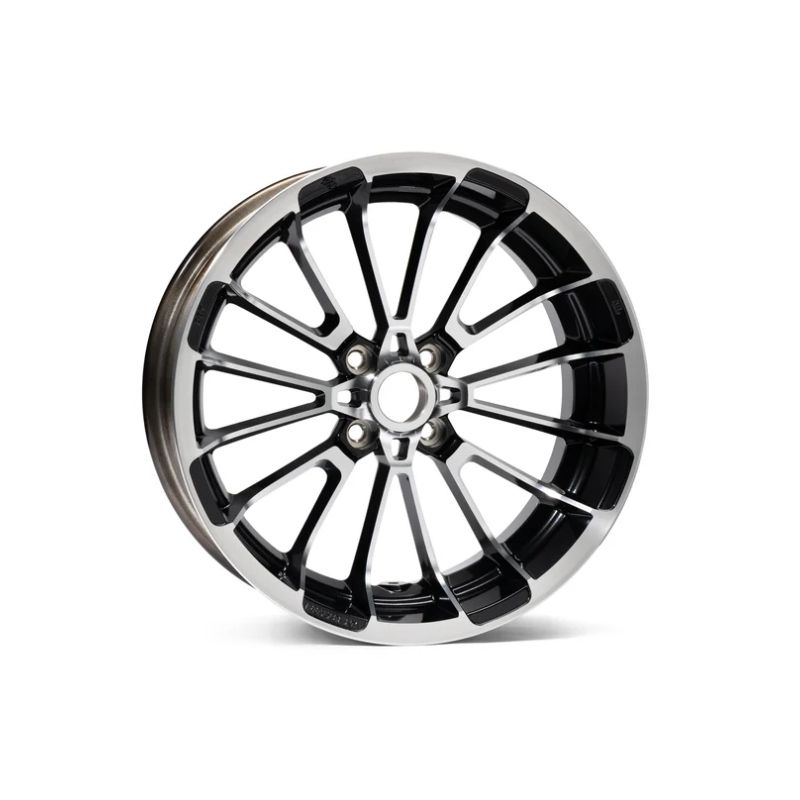 18" bakhjul i glanssvart med bearbetade detaljer som avslöjar rå aluminium.